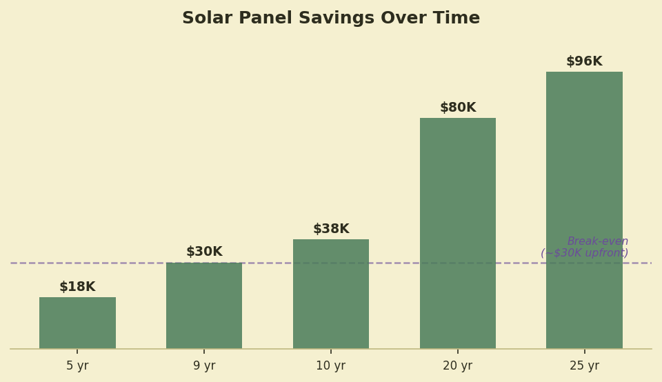 Over 20–25 years, total savings can approach or exceed $80,000–$100,000 (for a net savings between $40,000 to $70,000) depending on consumption habits, rooftop solar capacity, battery storage, and energy prices.