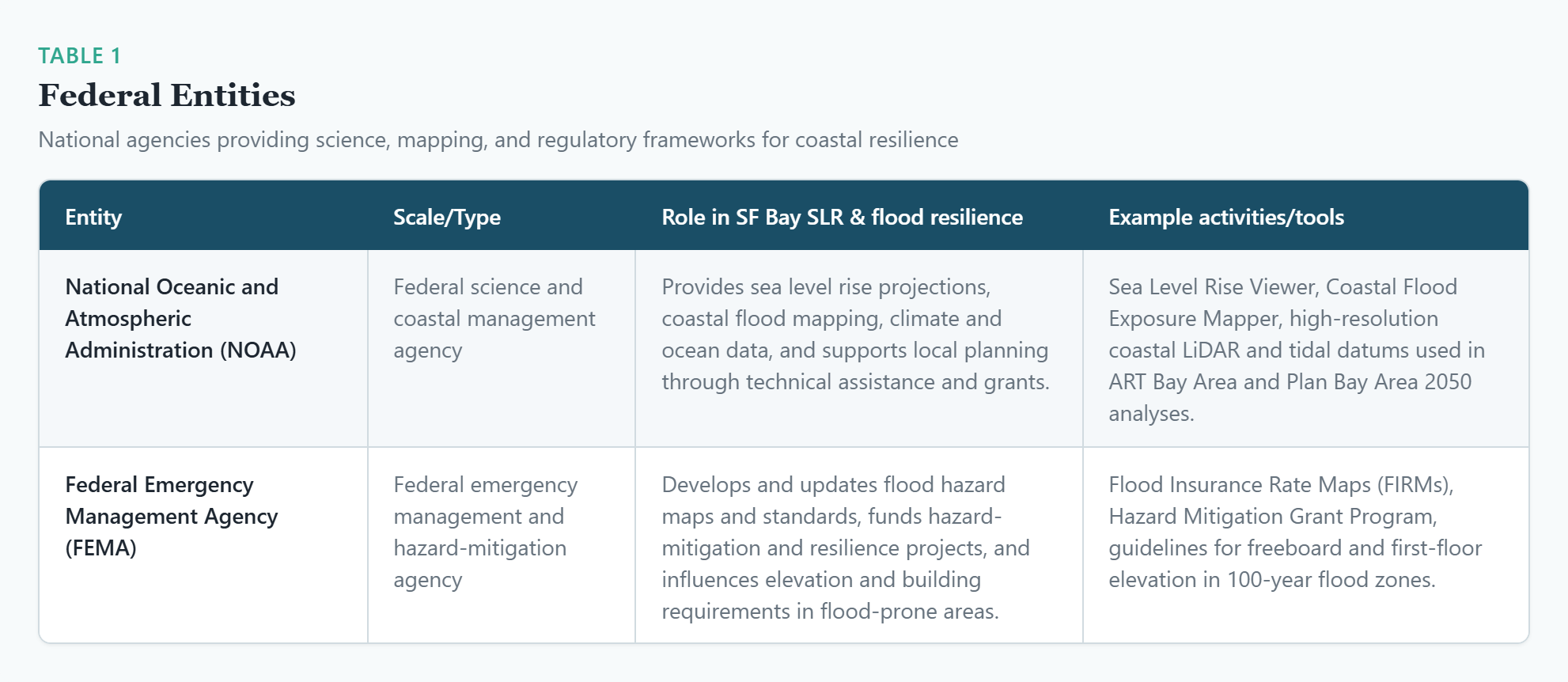 However, tools like these, and their wide availability, are made possible through a network of working partnerships and specialized contributions. In the Bay Area this work happens through collaborations that include key federal agencies — such as FEMA and NOAA — along with non-federal entities such as the California Ocean Protection Council, the SF Estuary Institute, SF Bay Regional CHARG and more.
