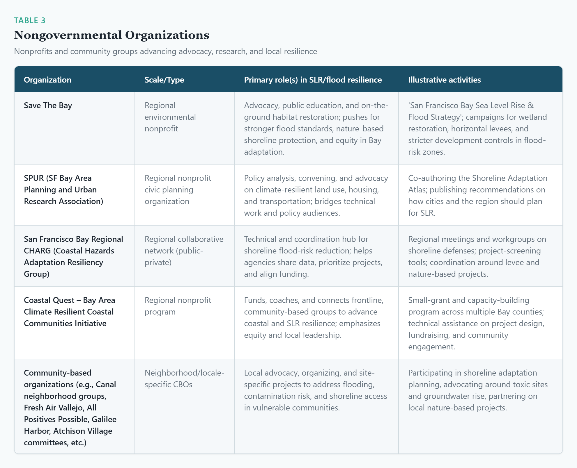 San Francisco Bay Regional CHARG (Coastal Hazards Adaptation Resiliency Group) – Regional collaborative focused on shoreline flooding and sea level rise; residents and community organizations can track its meetings and products to follow major adaptation projects and advocate for local priorities.