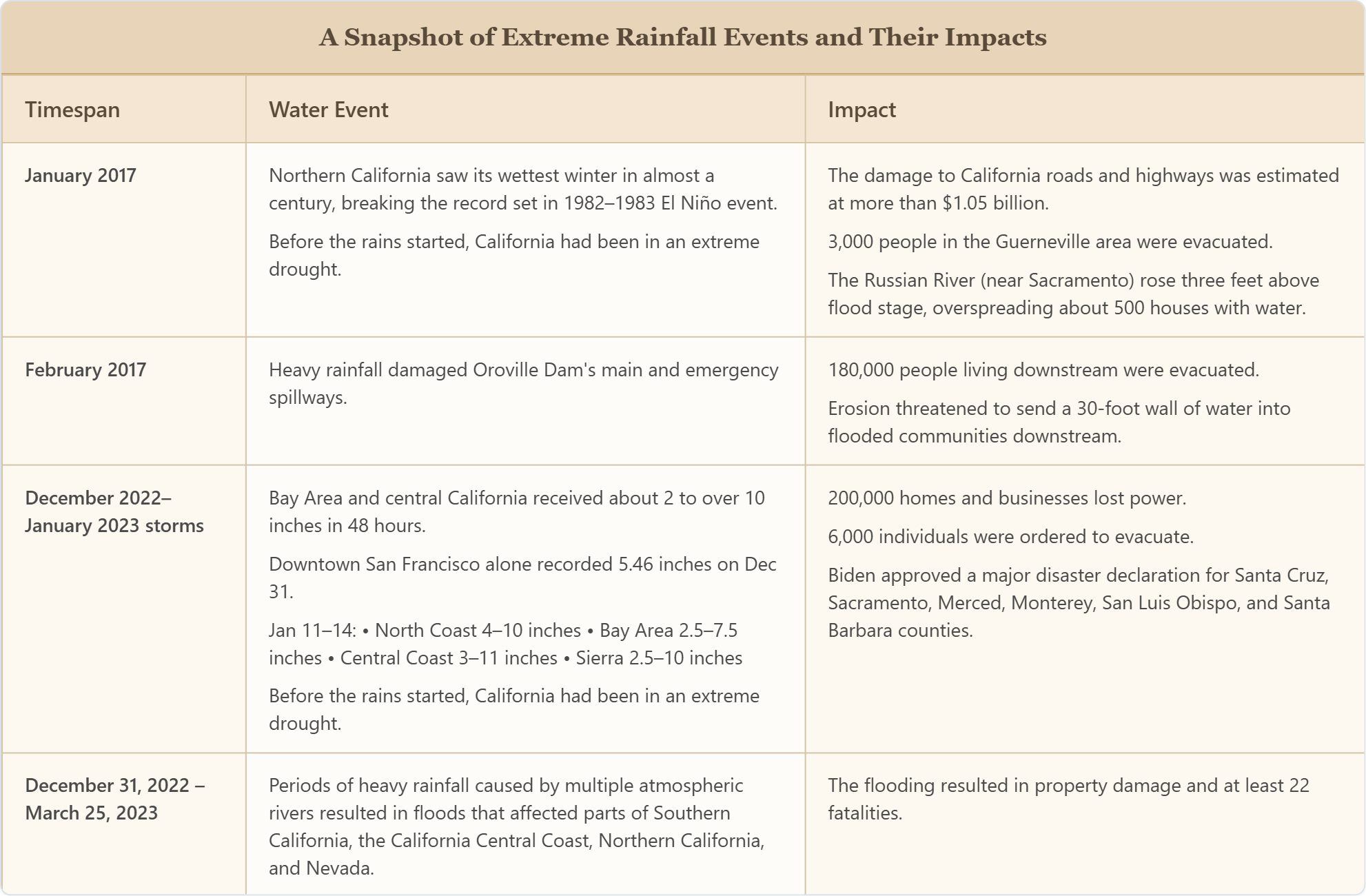 A growing body of research suggests that climate change is likely increasing the risk of extreme precipitation events along the Pacific coast of North America, including California, and of subsequent severe flood events” (“Climate change is increasing the risk of a California megaflood, Science Advances, 12 Aug 2022).